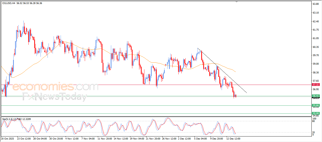 Crude oil continued its decline in its recent intraday trading, to reach $56.40 key support, which represents potential target in our previous analysis, to become threatened by breaking this support, amid the continuation of the negative pressure that comes from its trading below EMA50, and under the dominance of the main bearish trend and its trading alongside supportive minor trend line for this track.