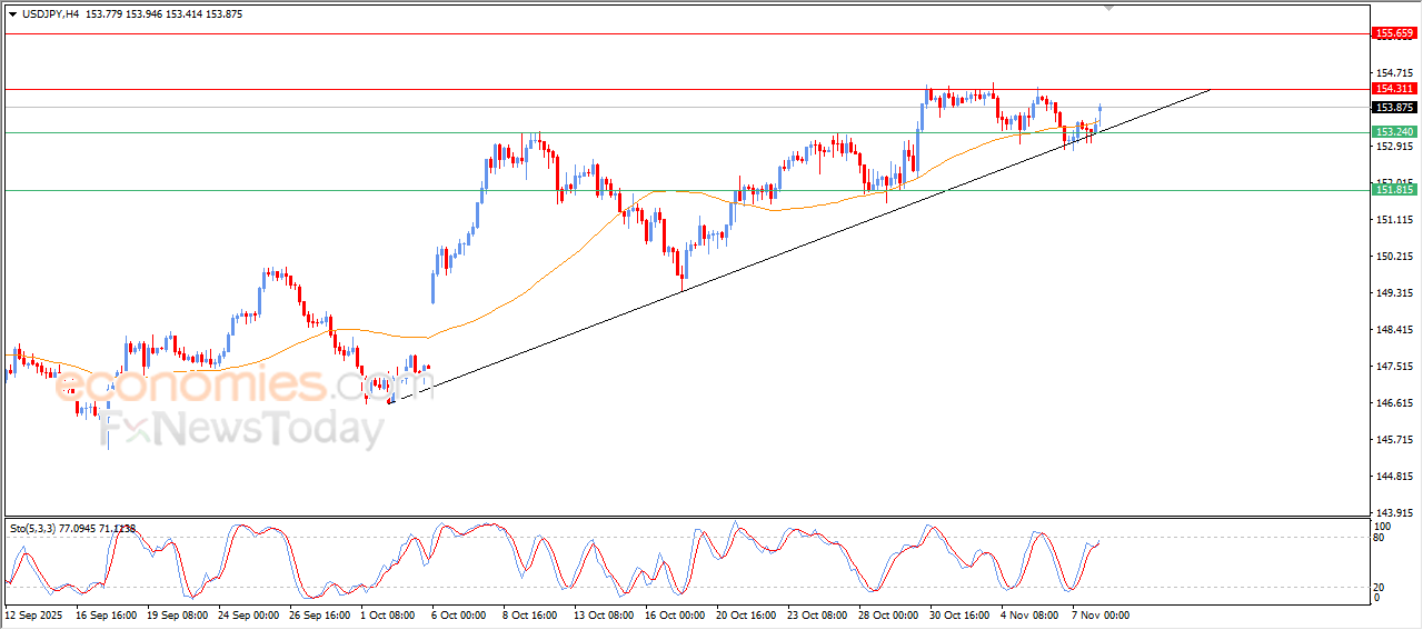The (USDJPY) surged higher in its last intraday trading, due to its leaning on a main bullish trend line on the short-term basis, gaining bullish momentum, supported by the emergence of the bullish signs on the relative strength indicators, to get rid of the negative pressure of the EMA50, and attacking the key resistance level at 154.30, which reinforces the chances of targeting new resistance levels on the intraday basis.