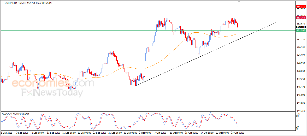 The (USDJPY) declined in its last intraday trading, due to the stability of the key and stubborn resistance at 153.25, attempting to look for rising low to take it as a base to gain the required bullish momentum to recover and rise again, amid the continuation of the bullish pressure due to its trading above EMA50, and under the dominance of the main bullish trend and its trading alongside supportive minor trendline on the short-term basis, besides the relative strength indicators reaching exaggerated oversold levels compared to the price move.