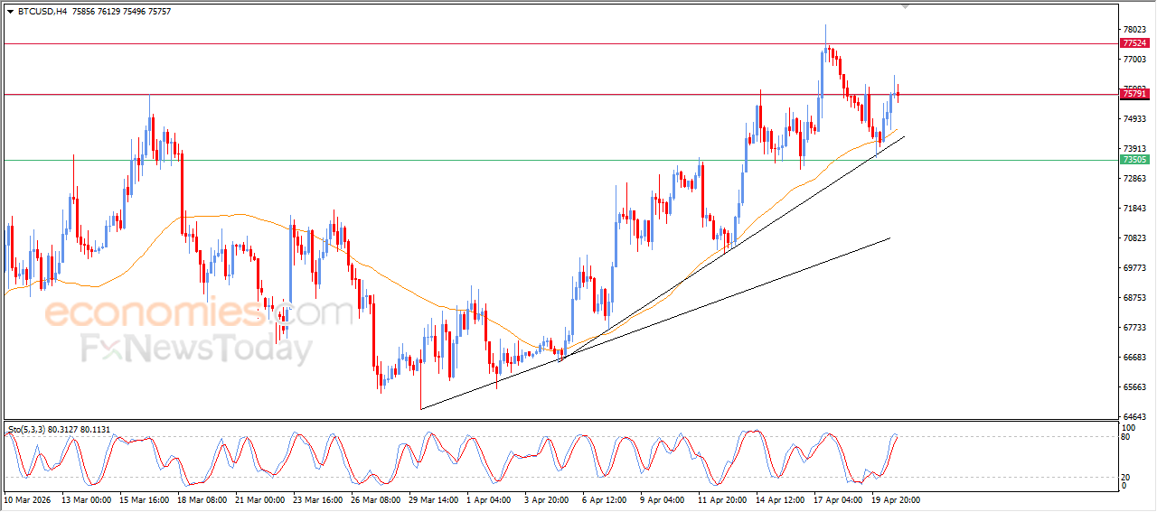 Bitcoin (BTCUSD) declined during its recent intraday trading, affected by the stability of the resistance level at $75,800. This move reflects a natural profit-taking phase following a recent rally. The pullback comes as the price attempts to ease overbought conditions on the relative strength indicators, with the emergence of a negative crossover, signaling a temporary slowdown in momentum.