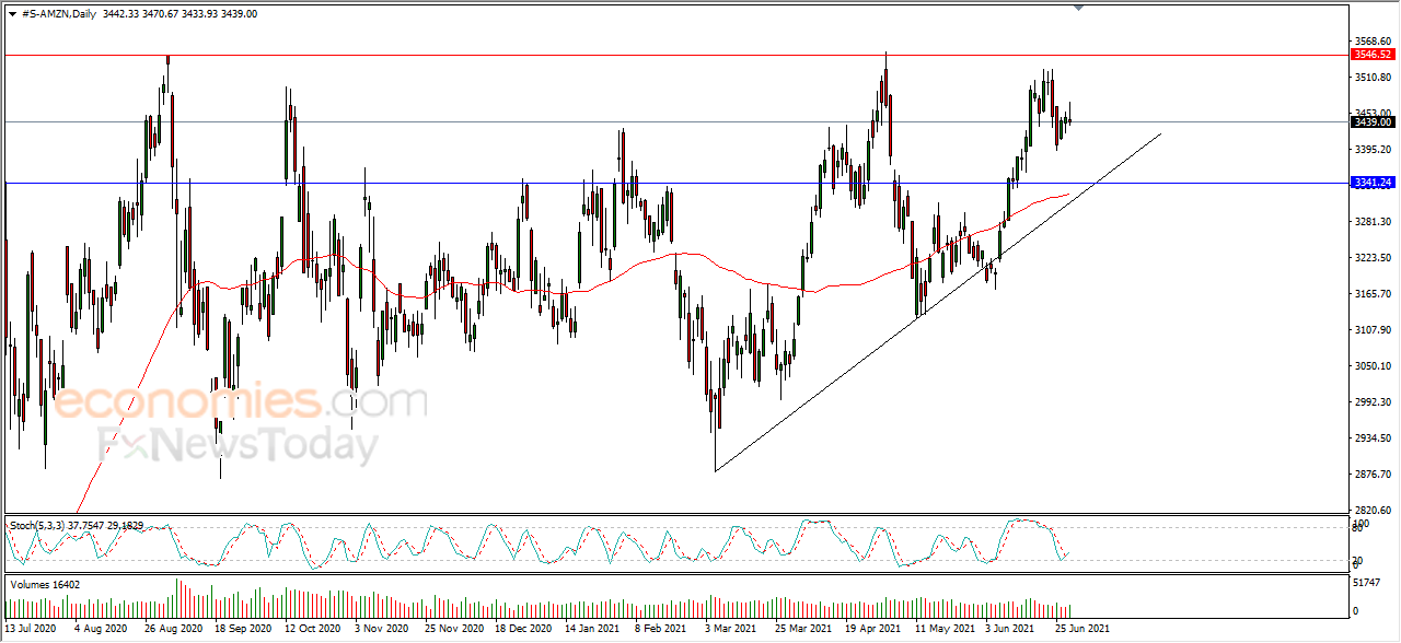 Amazon's stock fell 0.23% in the last session while settling at 3,440, as it gathers positive momentum to help it rise anew, amid the dominance of the upward short-term trend, with positive pressure from the 50-day SMA, coupled with positive signals from the RSI after reaching oversold levels.