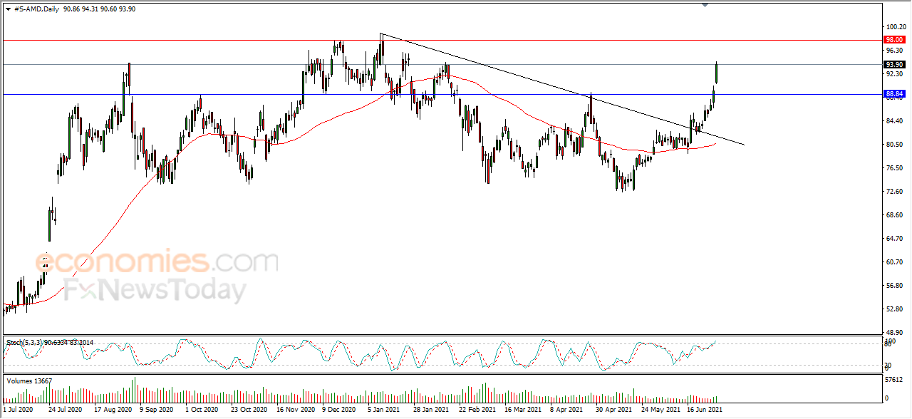 AMD's stock rallied 4.93% in the last session while buoyed by piercing the downward correctional trend line recently, amid positive support from the 50-day SMA, coupled with positive signals from the RSI despite reaching overbought levels.