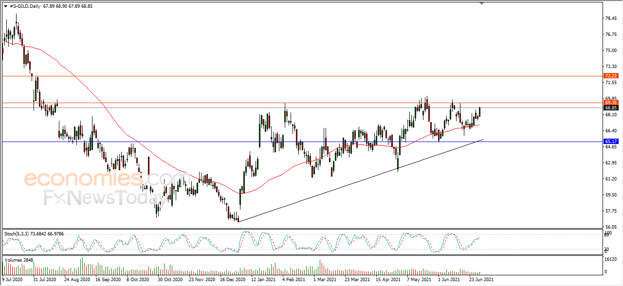 Gilead's stock (GILD) rose 1.37% in the last session amid the dominance of the upward correctional short-term trend, with positive support from the 50-day SMA, coupled with positive signals from the RSI, readying to tackle the pivotal resistance of 69.35.