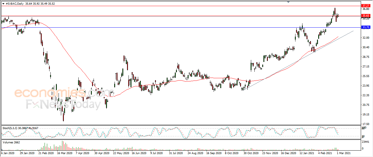 Bank of America's stock (BAC) fell 0.73% in the last session, amid attempts to gather momentum to help it rise and pierce the pivotal resistance of 35.65, amid the dominance of the main upward trend in the medium and short terms, with positive support from the 50-day SMA.