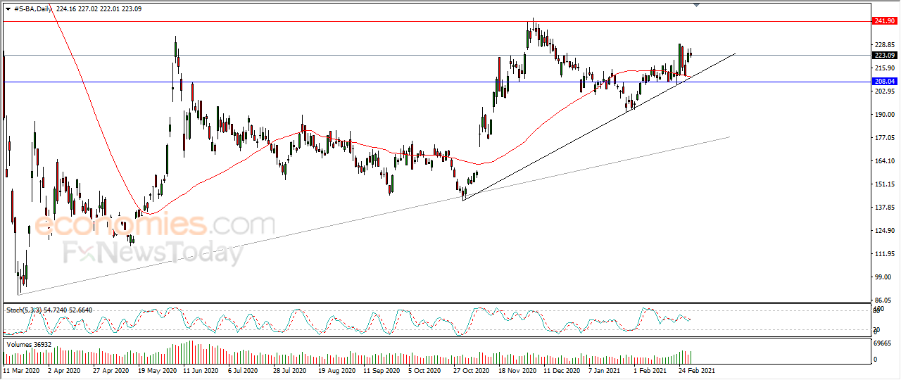 Boeing's stock (BA) returned lower with a 0.56% loss in the last session, amid the dominance of the main upward trend in the medium and short terms, with positive pressure from the 50-day SMA, while gathering momentum to help it rise anew.