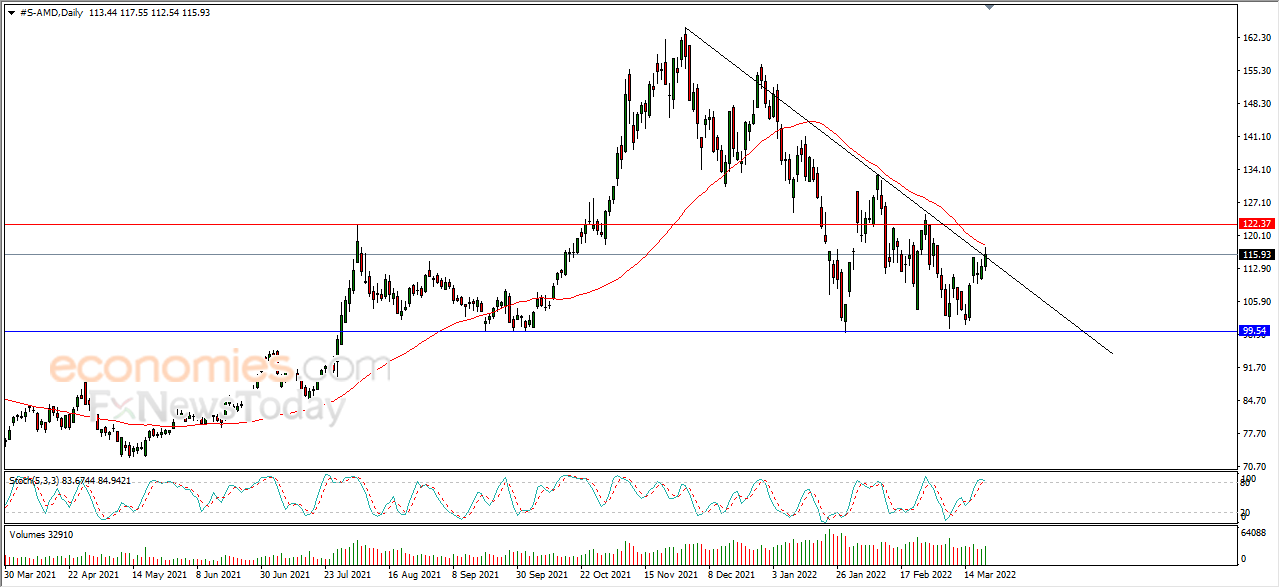 AMD's stock rose 2.17% in the last session, settling at 115.92, and testing the resistance of the downward correctional trend line in the short term, while touching the resistance of the 50-day SMA, amid negative signals from the RSI, after reaching overbought levels.
