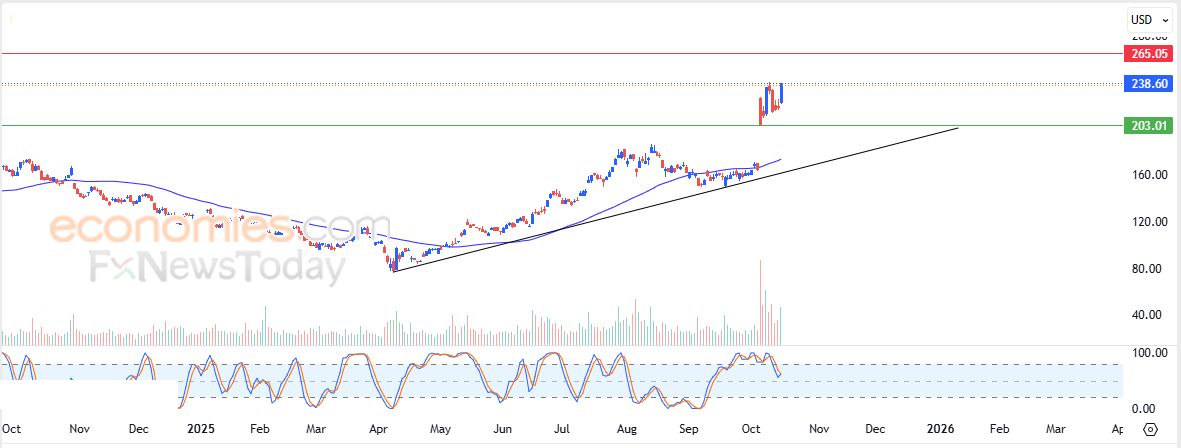 Therefore, we expect the stock to rise in its upcoming trading sessions as long as the support level of 203.00$ holds, targeting the resistance level of 265.00$.