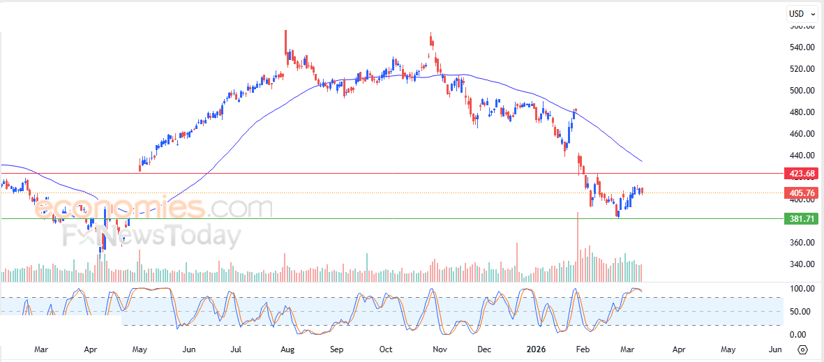 Microsoft Corp (MSFT) stock price recorded a decline in its latest intraday trading, amid the dominance of a short-term corrective bearish trend, with continued negative pressure resulting from trading below its 50-day SMA, which reduces the chances of a full recovery in the near term. In the background, the Stochastic indicator is beginning to show negative signals after reaching extremely overbought levels relative to price action, suggesting the early formation of a negative divergence that increases the surrounding downside pressure.