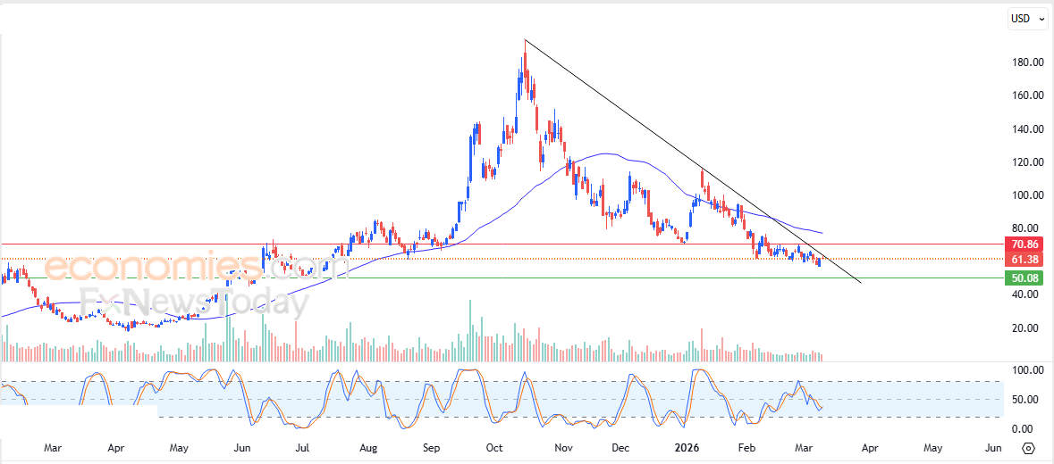 Oklo (OKLO) stock price recorded a slight decline in its latest intraday trading, amid the dominance of a short-term corrective bearish trend, with price moving alongside a trendline supporting this path. Negative dynamic pressure remains in place as the stock continues to trade below its 50-day SMA, in addition to the emergence of negative signals from the Stochastic indicator after reaching extremely overbought levels.