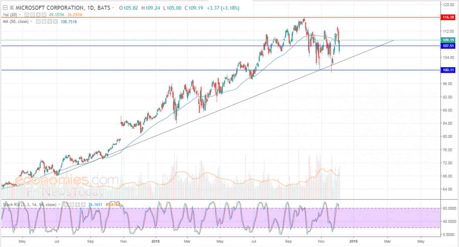 Microsoft's stock rose 0.62%, or 0.67 points, amid the dominance of the main upward trend in the medium and short terms, with positive pressure from the 50-day SMA, while trying to vent off overbought saturation in the RSI.