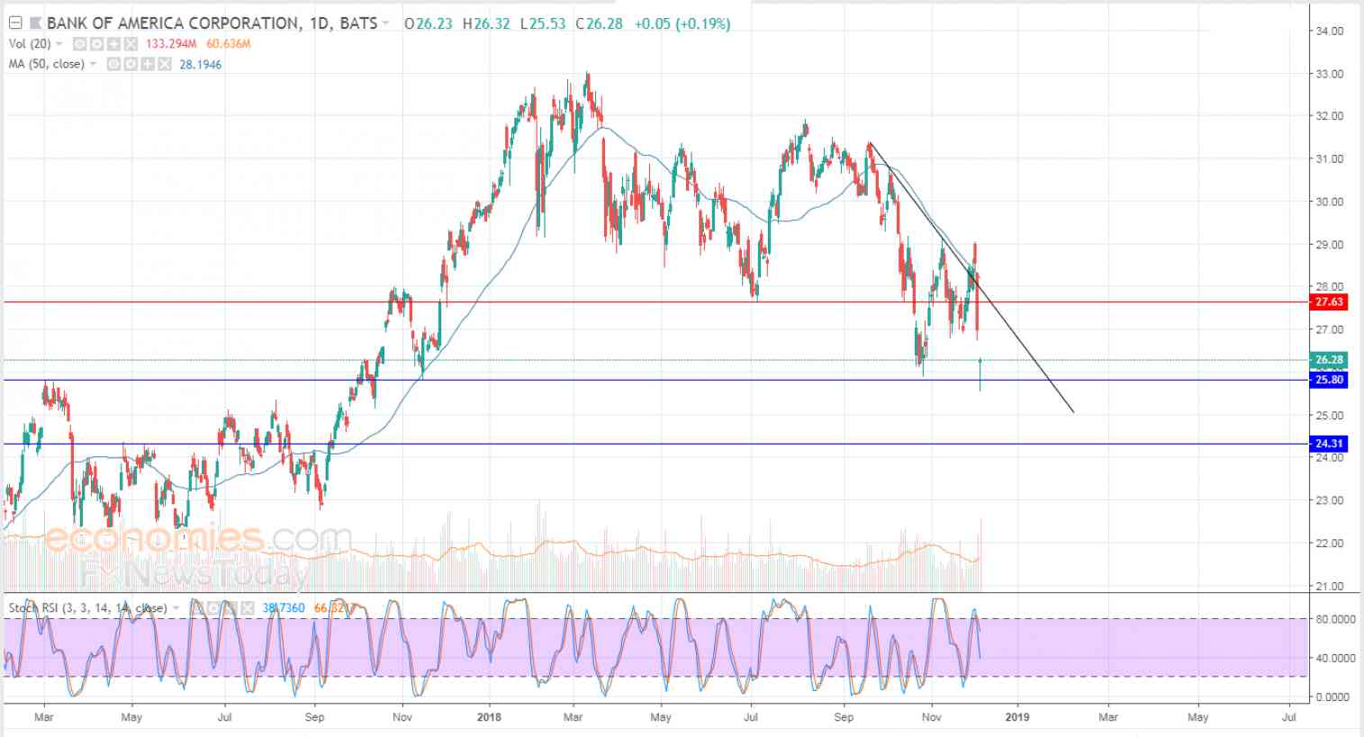 Bank of America's stock skidded 2.63% in the last session, or 0.71 points, amid the dominance of the downward correctional wave in the short term, with negative pressure from the 50-day SMA, coupled with negative signals from the RSI, and accompanied by a surge in trading volumes.
