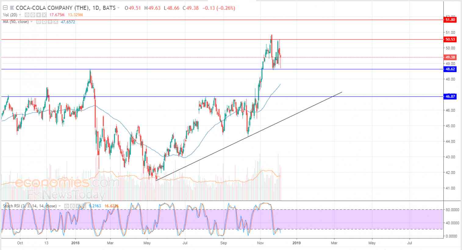 Coca-Cola's stock plumbed an intraday low at 49.50, bouncing off it higher and paring the losses to a modest 0.40%, or 0.20 points, while the RSI reached oversold saturation in the RSI, with the dominance of the main upward trend in the medium and short terms, coupled with positive pressure from the 50-day SMA.