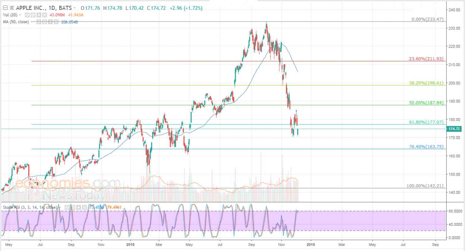 Apple's stock fell 1.11% in the last session, or 1.97 points, while settling anew below 177.07, representing the ratio 61.8% of Fibonacci retracement levels for an ascending wave in the medium term (from 142.21 to 233.47), while the RSI reached overbought levels compared to the stock's movements.