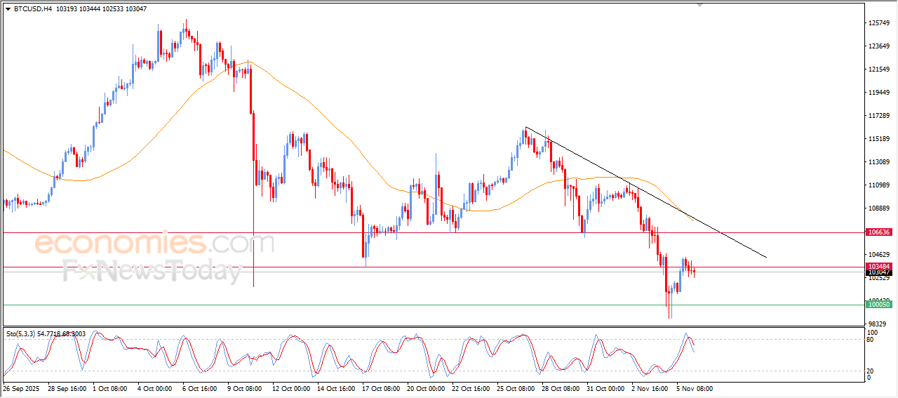 Bitcoin (BTCUSD) prices declined during their last intraday trading, due to the stability of the resistance at $103,500, with the beginning of forming negative divergence on the relative strength indicators, after reaching exaggerated overbought levels compared to the price move, with the beginning of the negative signals emergence, amid the dominance of the main bearish trend and its trading alongside minor trendline on the short-term basis.