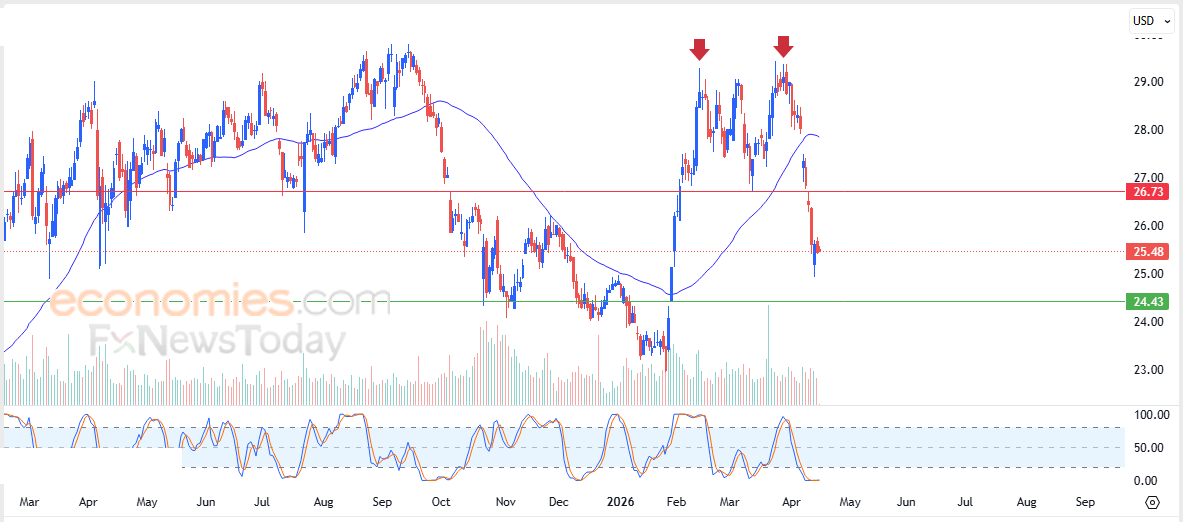 Therefore, we expect the stock price to decline during its upcoming trading sessions, as long as resistance at 26.75 remains intact, targeting the first support level at 24.45.