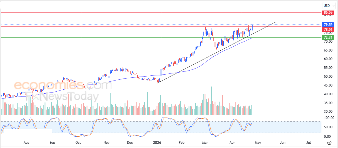 International Seaways, Inc. (INSW) stock price was colored green in its latest intraday trading, succeeding in surpassing the key resistance level of 78.50. This performance allowed the stock to record a new high, influenced by the dominance of the main medium-term bullish trend and its movement along a minor short-term trendline that supports this path. Additionally, positive pressure continues from trading above its 50-day SMA, while positive signals emerge from the Stochastic indicator in the background.