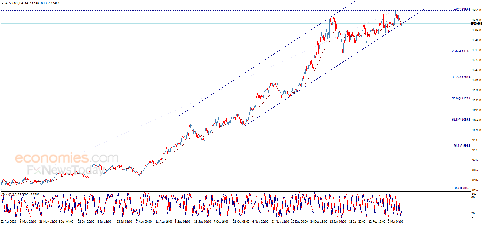Soybean price tests the first key resistance 1405.00 now, and as we mentioned this level and below 1414.00 to keep the correctional bearish scenario valid for the upcoming period, which targets 1373.00 initially, taking into consideration that breaching the mentioned resistance levels will push the price back to the main bullish track and achieve targets that start at 1454.00.