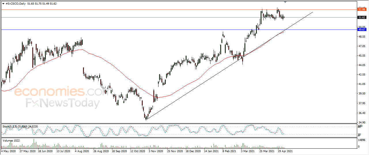 Cisco Systems stock fell 0.52% in the last session, while gathering positive momentum to help it rise anew, amid the dominance of the main upward trend in the medium term, with positive signals from the RSI after reaching oversold levels, coupled with positive support from the 50-day SMA.