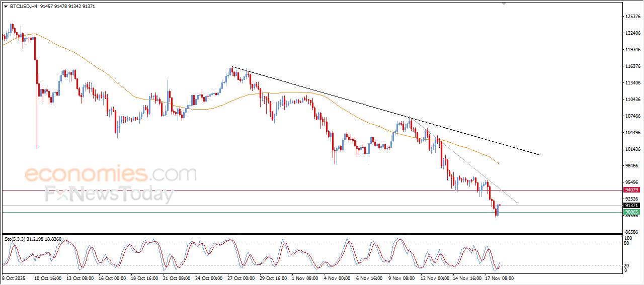 Bitcoin (BTCUSD) prices rose on their last intraday trading, after reaching our morning target at the main support at $90,000, with the stability of the support that provided bullish momentum that helped the price to achieve these gains, recovering some of its previous losses, and offloading some of its oversold conditions on the relative strength indicators, especially with the emergence of the positive signals from there, amid the dominance of the main bearish trend on the short-term basis.