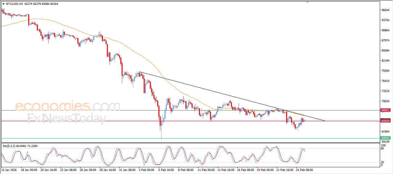 BTCUSD price declined in its last intraday trading, amid the dominance of the main bearish trend on short-term basis, with its trading alongside supportive minor trend line for this bearish track, besides the negative pressure due to its trading below EMA50, besides the emergence of negative signals from relative strength indicators, after reaching exaggerated overbought levels compared to the price move.