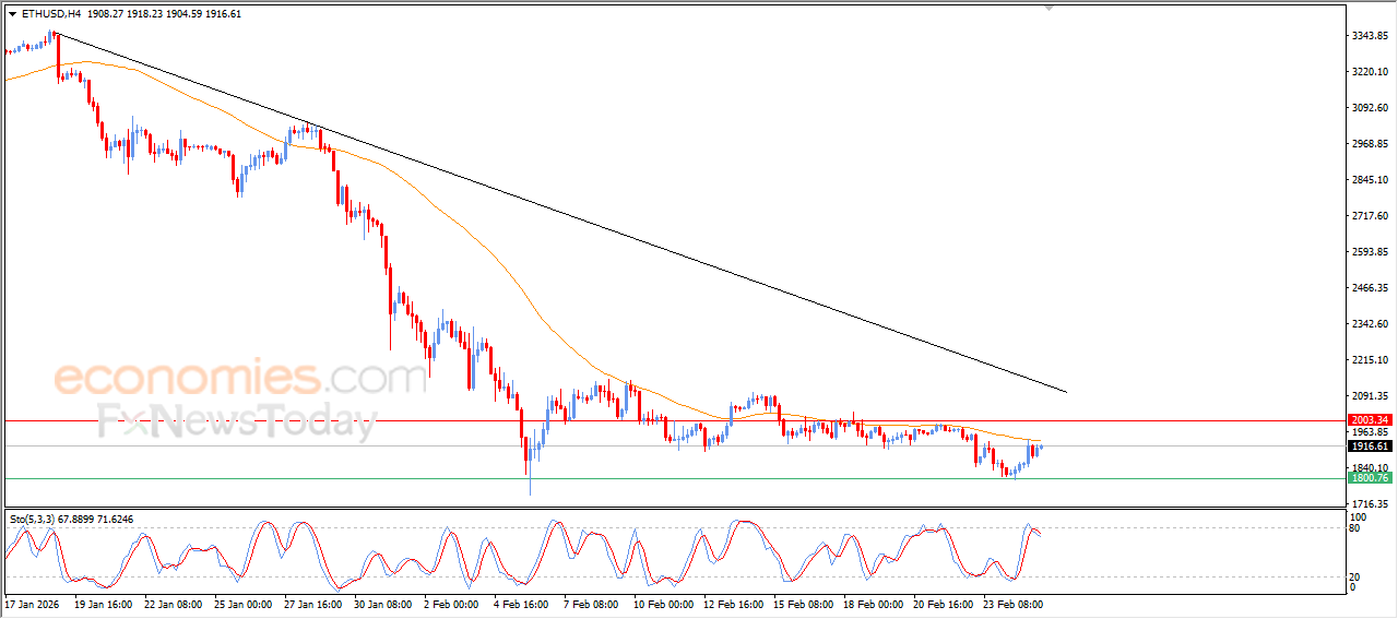 The price of (ETHUSD) keeps its early gains for today, reaching EMA50’s resistance, which reduces the chances of extending gains on near-term basis, especially with the dominance of the main bearish trend on short-term basis, with the beginning of forming negative divergence on the relative strength indicators, after reaching exaggerated overbought levels compared to the price move, with the emergence of the negative signals.