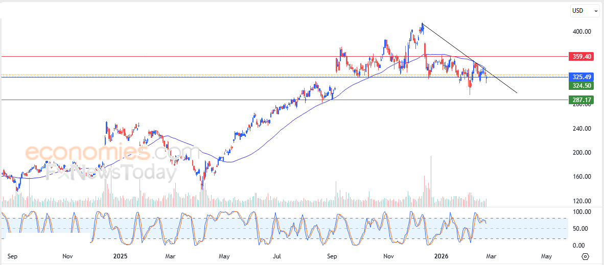 Therefore we expect the stock price to decline during its upcoming trading sessions, especially if it breaks below the current support level at $324.50, targeting the next support level at $287.00.