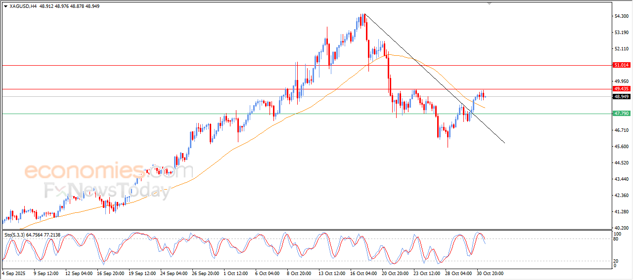 The price of (silver) witnessed fluctuated trading on its last intraday levels, amid the attempts of gaining bullish momentum that might help it to breach the key resistance level at $49.45, attempting to offload some of its overbought conditions on the relative strength indicators, especially with the emergence of the negative signals, affected by breaching bearish corrective trend line on the short-term basis, taking advantage of its trading above EMA50, which provides renewed bullish momentum.