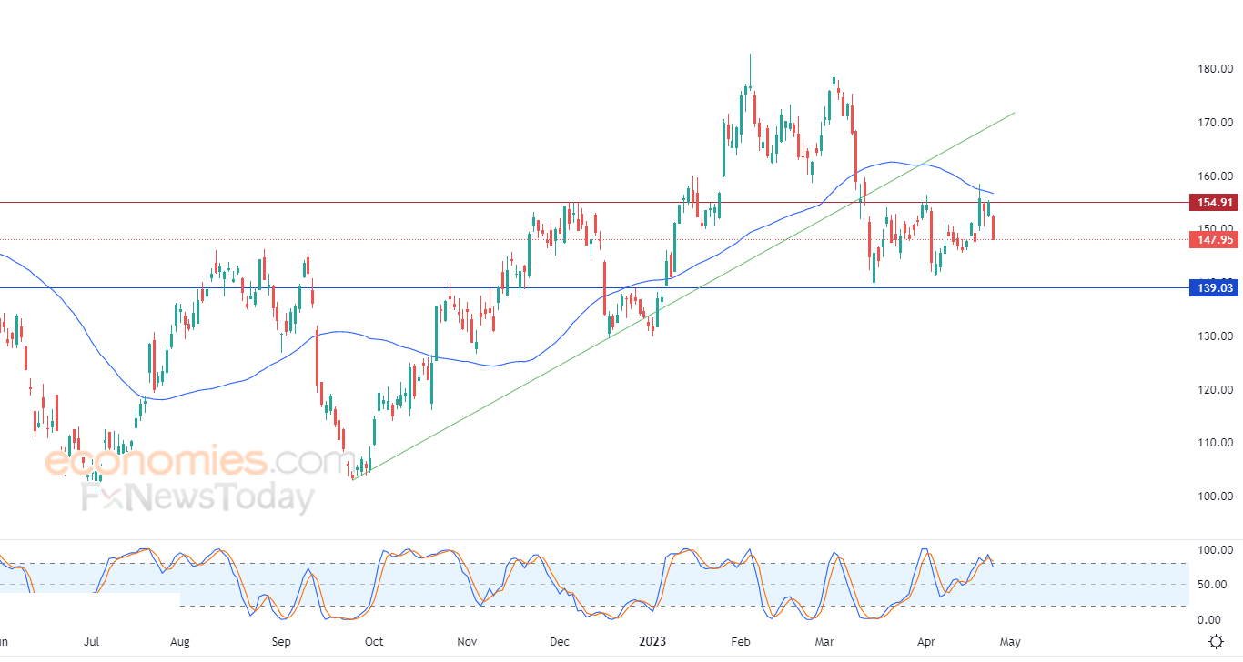 Nucor Corporation's stock (NUE) skidded in the intraday levels after touching the resistance of the 50-day SMA, amid the dominance of the downward correctional short-term trend, while hurt by piercing the main upward trend line previously, with negative signals from the RSI after reaching overbought levels, marking a hefty loss of 4.57% in the last session, or 7.09 points, and settling at 147.95.