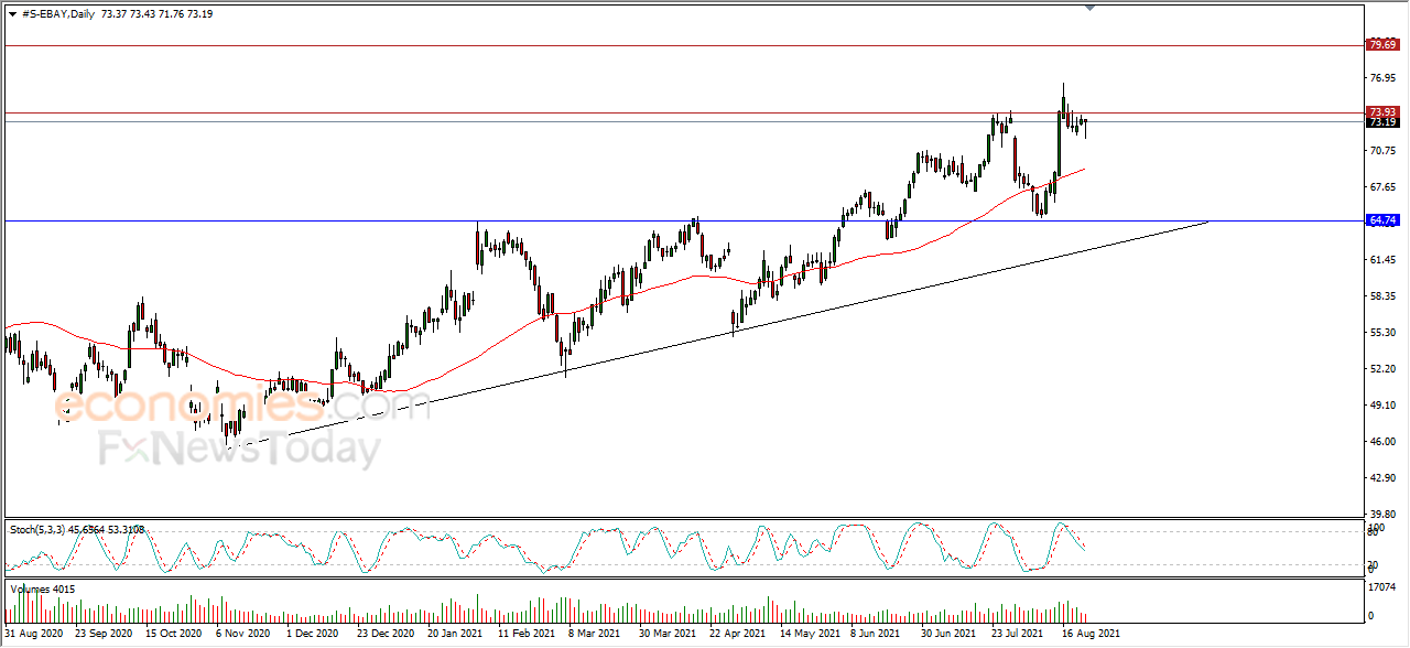 eBay's stock declined 0.22% in the last session amid negative signals from the RSI after the important resistance of 73.93 holds on, while gathering positive momentum to pierce the resistance, amid the dominance of the main upward medium-term trend, with positive pressure from the 50-day SMA.