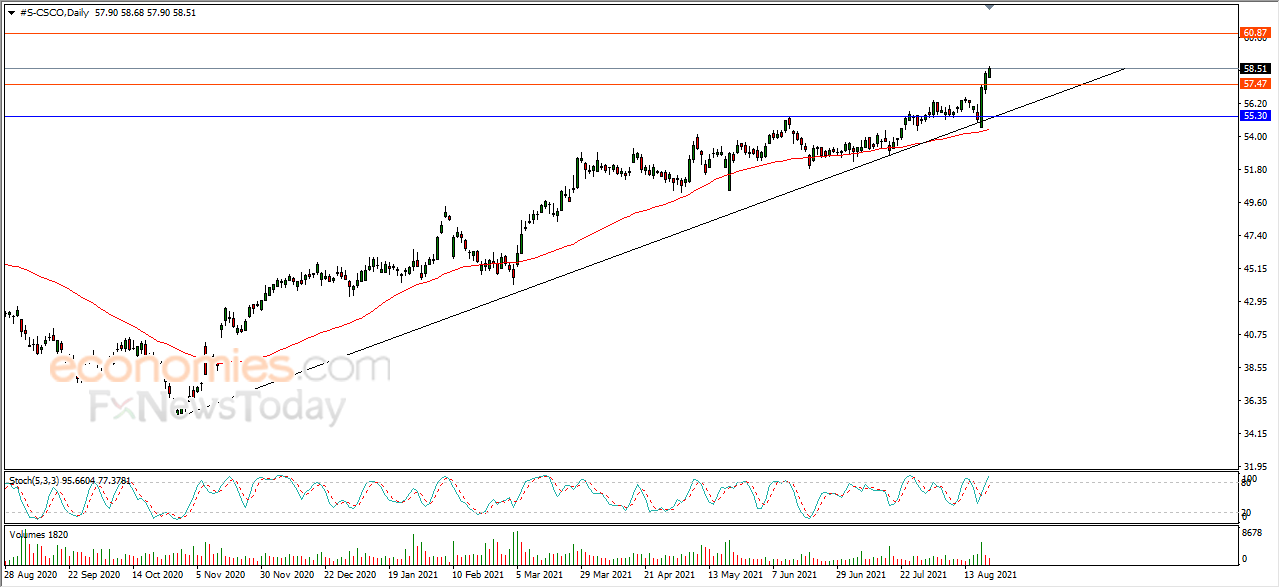 Cisco's stock (CISCO) rose 0.55% in the last session amid the dominance of the main upward trend in the medium term, with support from the 50-day SMA, coupled with positive signals from the RSI despite reaching overbought levels.
