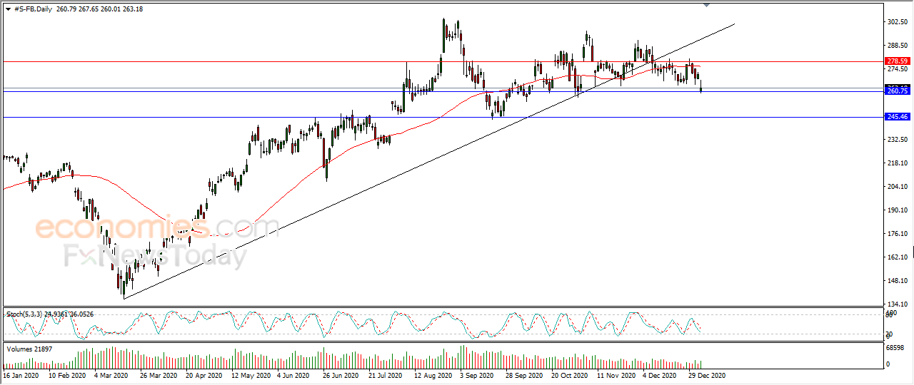 Facebook's stock (FB) fell 2.83% in the last session while hurt by piercing the main upward trend line recently, with negative pressure from the 50-day SMA.