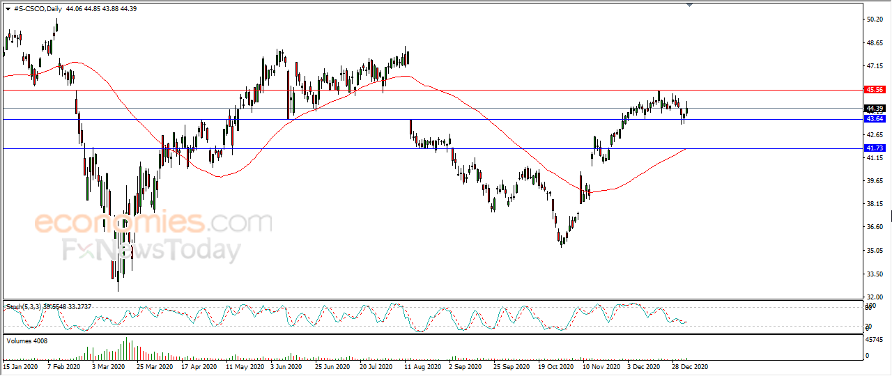 Cisco Systems' stock (CISCO) rose 0.95% in the last session amid the dominance of the upward correctional trend in the short term, with positive pressure from the 50-day SMA, coupled with positive signals from the RSI after reaching oversold levels.