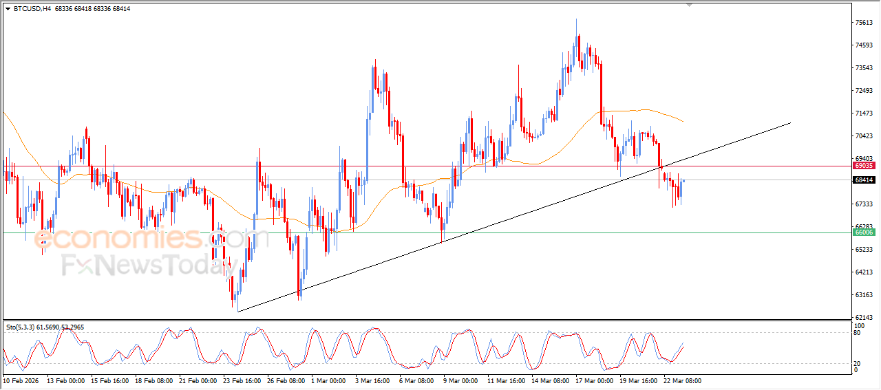 BTCUSD price rose in its last intraday trading, supported by the emergence of the positive signals from the relative strength indicators, attempting to recover some previous losses, affected by breaking main bullish trend line on short-term basis, with the continuation of the negative pressure due to its trading below EMA50, which reduces the chances of full recovery on a near-term basis.