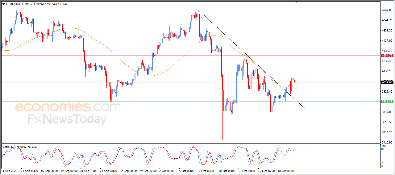 The price of (ETHUSD) declined in its last intraday trading, gathering the gains of its previous rises, and attempting to offload some of its overbought conditions on the relative strength indicators, especially with the emergence of the negative signals, to gather its positive strength that might help it to recover and rise again, affected by breaching minor bearish trendline on the short-term basis, with the continuation of the dynamic support that is represented by its trading above EMA50, forming a dynamic support that reinforces the chances of its recovery.
