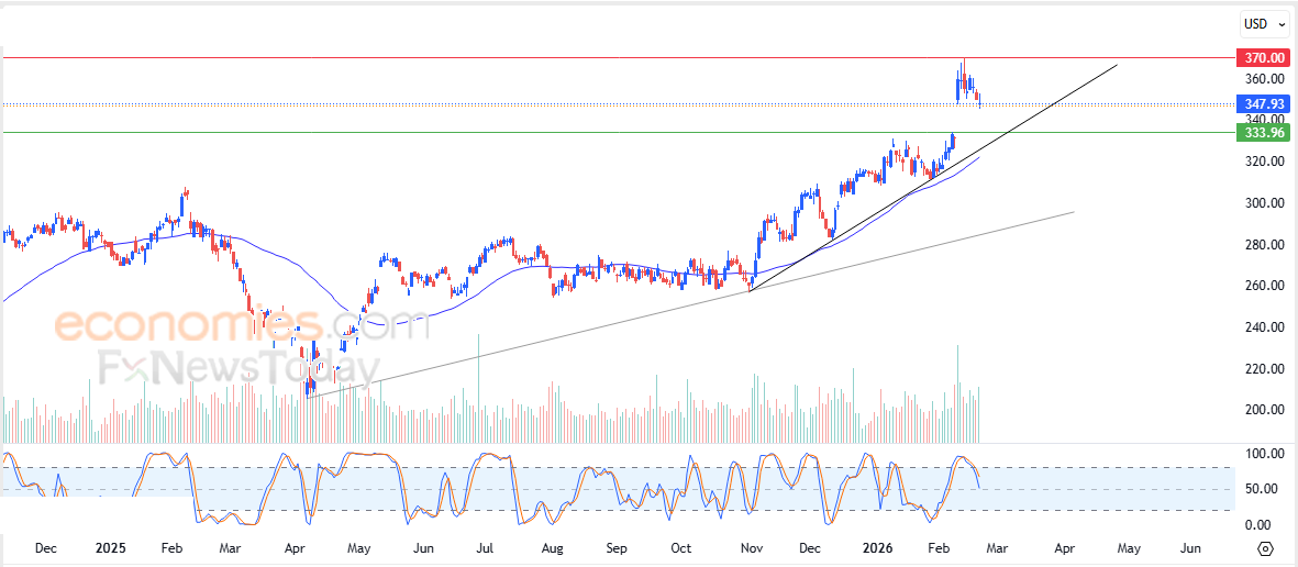 Therefore we expect the stock price to rise during its upcoming trading sessions, as long as support at $333.95 remains intact, targeting the resistance level at $370.00.