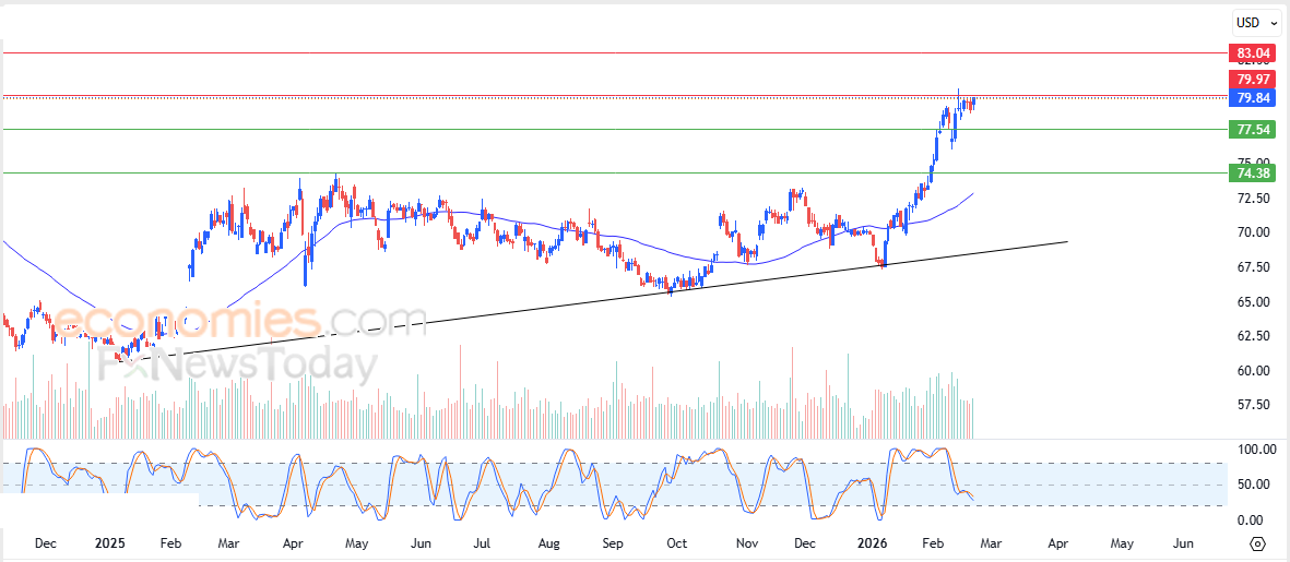 Coca-Cola Company (KO) stock price recorded gains in its latest intraday trading, as it attempts to test the current resistance level at $80.00, amid the dominance of the main bullish trend over both the medium and short term. Positive pressure remains in place as the stock continues to trade above its 50-day SMA, while the recent rise came after the price successfully eased its overbought conditions on the Stochastic indicator, giving it more room to extend gains in the near term.
