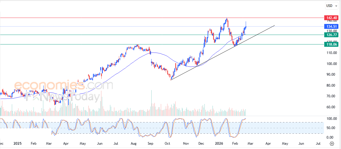 Therefore we expect the stock price to rise during its upcoming trading sessions, as long as support at $126.75 remains intact, targeting the nearby key resistance level at $142.40 in preparation for a potential test.