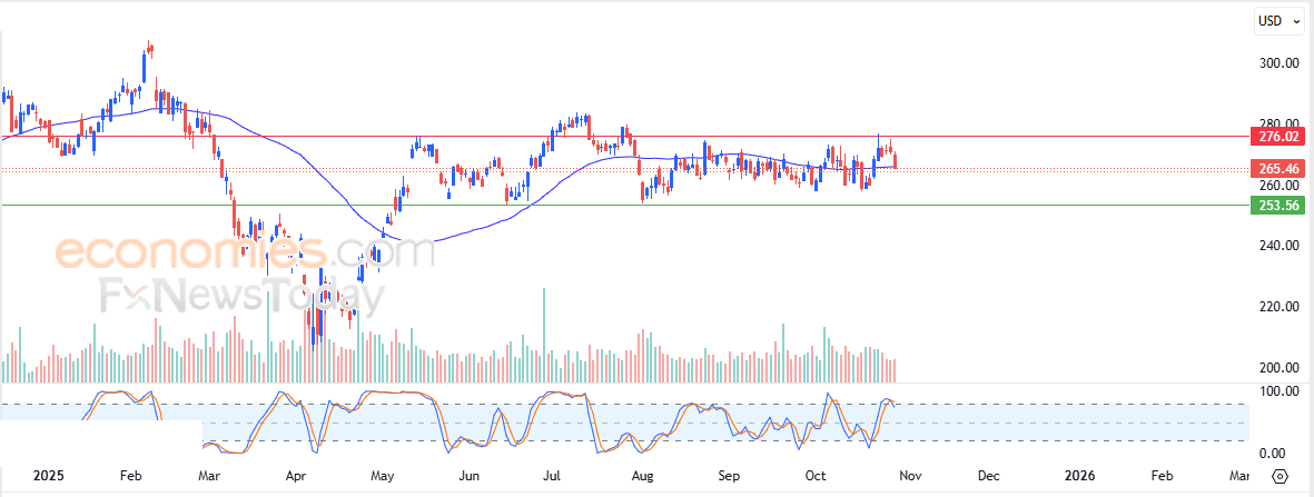 Marriott International Inc. (MAR) shares declined in their latest intraday trading, as the stock continued to move sideways in the short term, fluctuating around its 50-day simple moving average. The decline came after the price faced strong resistance at the key 276.00$ level, coinciding with negative signals appearing on the relative strength indicators after reaching overbought zones.