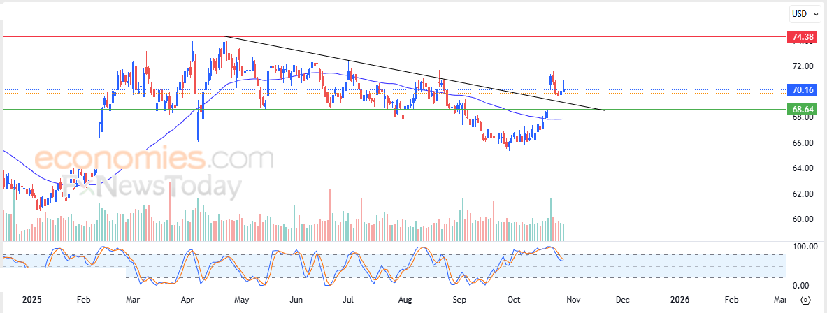 Therefore, we expect the stock to rise in upcoming trading sessions as long as it remains above the 68.65$ support level, targeting the key resistance level at 74.35$.