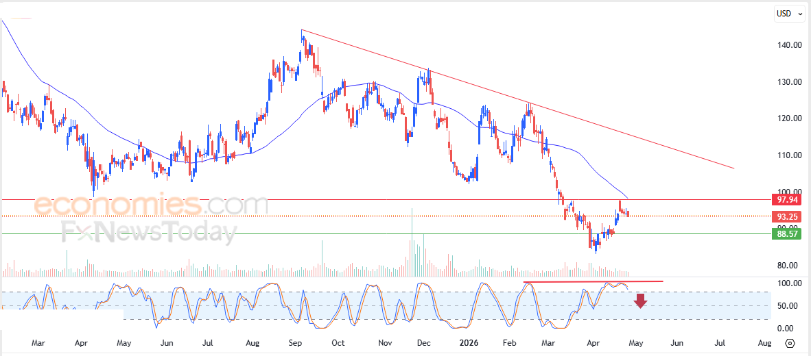 Therefore, our expectations indicate a decline in the stock price during its upcoming trading sessions, as long as the resistance level at 97.95 remains intact, targeting the first support level at 88.50.
