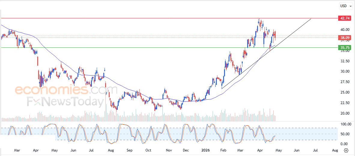 Therefore, our expectations indicate a rise in the stock price during its upcoming trading sessions, as long as the support level at 35.75 remains intact, targeting the key resistance level at 42.75.