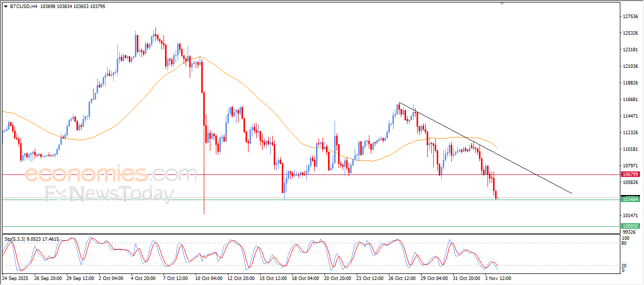 Bitcoin (BTCUSD) prices kept declining during their last intraday trading, reaching the key support of $103,500, which represents our expected target in our previous analysis, amid the dominance of the bearish trend on the short-term basis, besides the emergence of the negative signals on the relative strength indicators, after offloading their oversold conditions in its previous trading, intensifying the negative pressure.