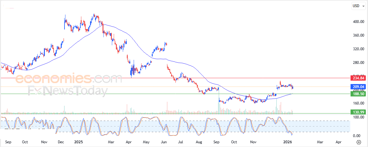 Therefore we expect the stock price to rise in upcoming trading, as long as the $188.50 support level holds, to target the $234.85 resistance level.