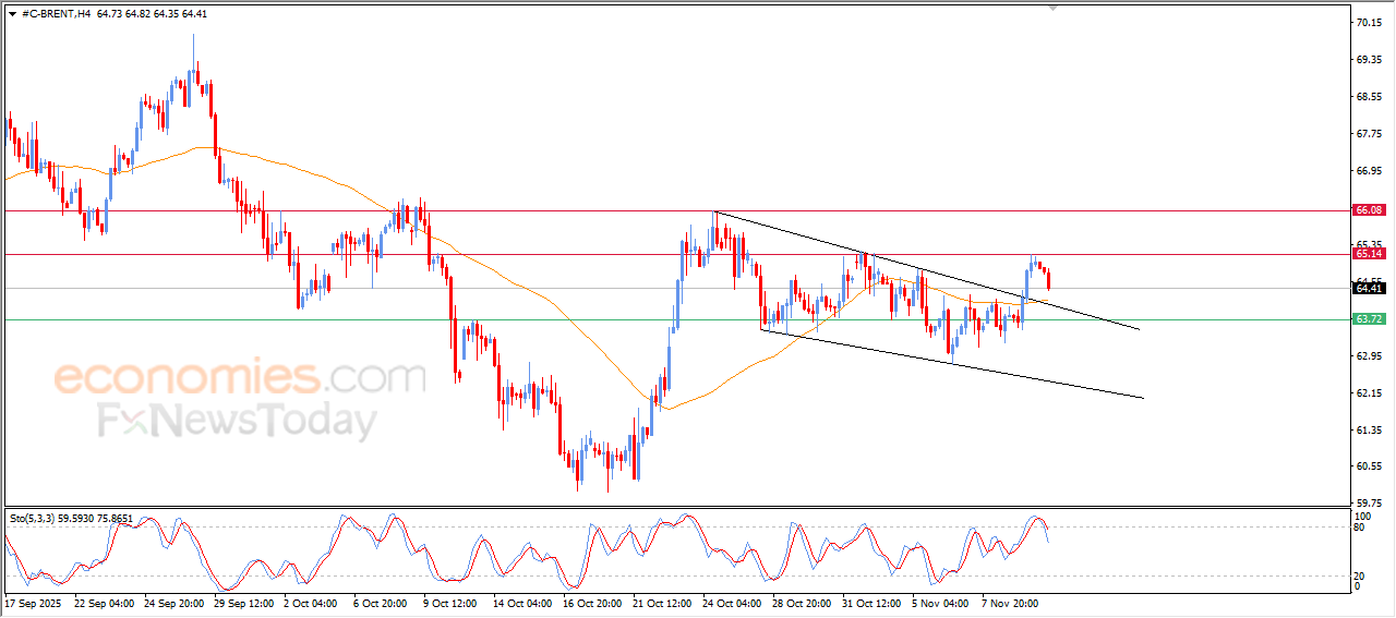 Brent crude oil prices declined in their last intraday trading, due to the stability of the key resistance at %65.00, to gain bullish momentum that might help it to breach this resistance, and attempt to offload its overbought conditions on the relative strength indicators, amid the continuation of the positive pressure that comes from its trading above EMA50, affected by positive technical formation that has formed on the short-term basis (the falling wedge pattern).