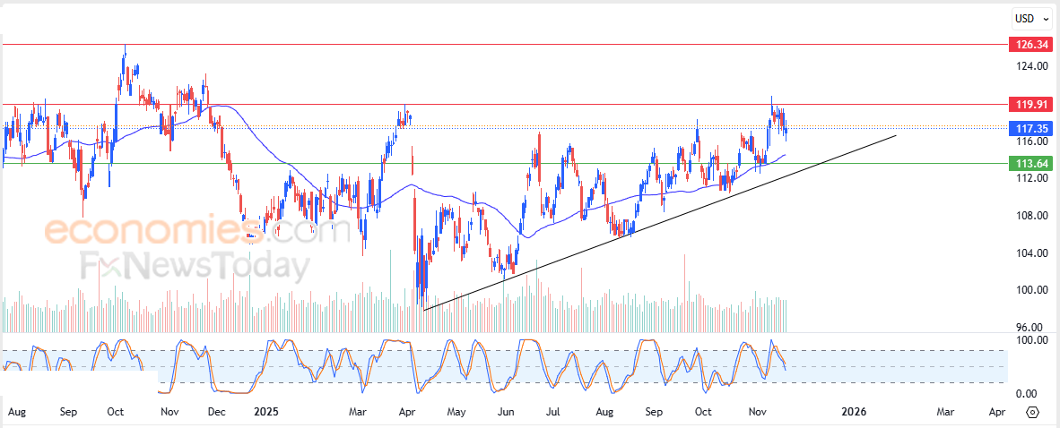 EXXON MOBIL CORPORATION (XOM) shares declined slightly in their latest intraday trading, after the key resistance level at 119.90 dollars held firm. The stock is attempting to gather positive momentum that may help it break above this barrier, while at the same time trying to unwind its overbought readings on the Relative Strength Indicators, especially with negative signals beginning to appear. This comes alongside continued dynamic support from trading above the 50-day simple moving average, with price action moving along an ascending trendline in the short term, which enhances the stock’s recovery prospects.