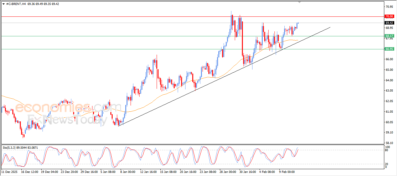 Brent prices rose in their last intraday trading, approaching from the key resistance at $70.00, amid the dominance of the main bearish trend on short-term basis, alongside supportive trend line, with the emergence of positive signals from relative strength indicators, besides the continuation of the positive pressure of EMA50, which reinforces the chances of extending the gains in the upcoming period.