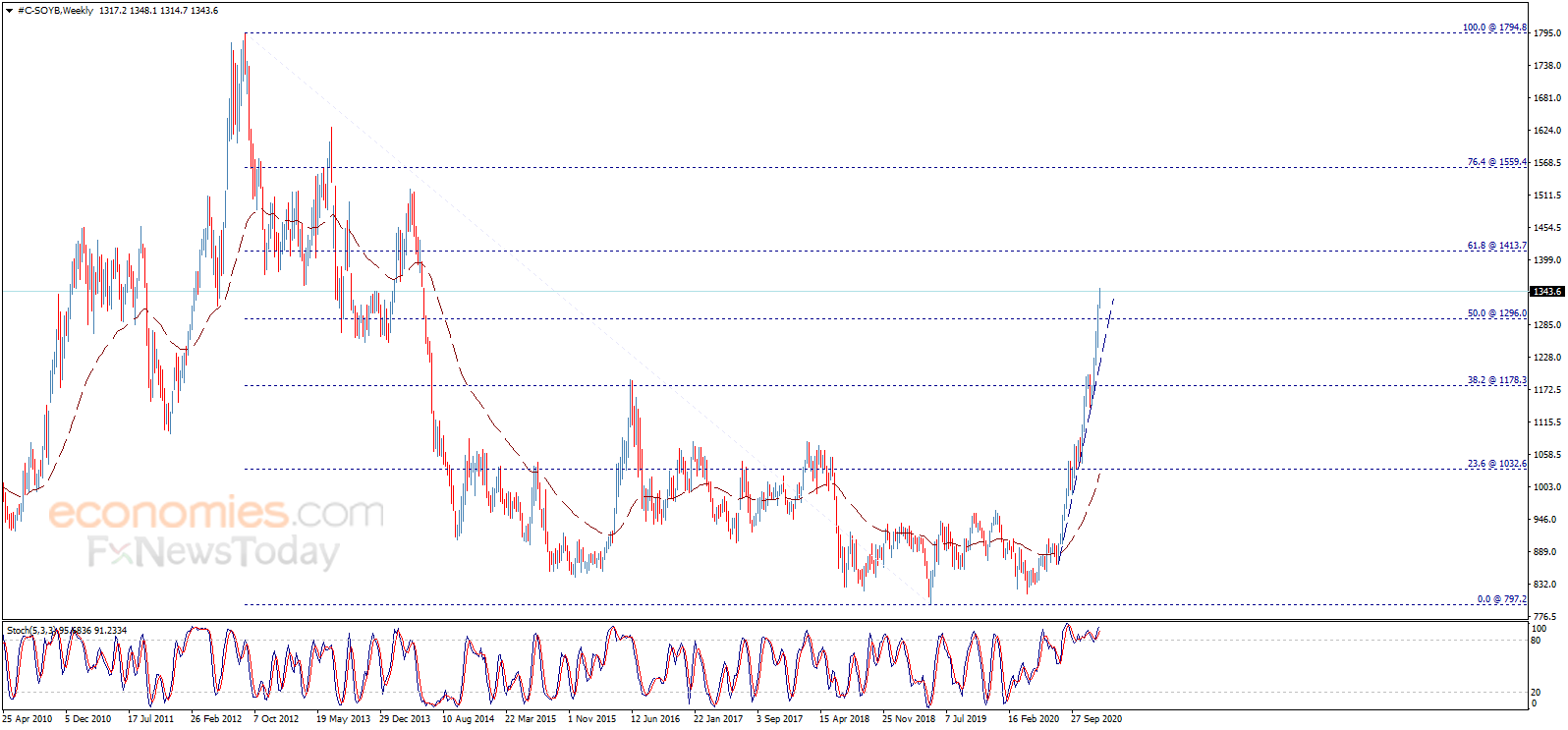 Soybean price provides additional positive trades to approach gradually from our waited target at 1355.00, to keep the bullish trend scenario valid and active for the rest of the day, reminding you that the extended targets reach 1413.70, while holding above 1296.00 represents key condition to achieve the suggested targets.