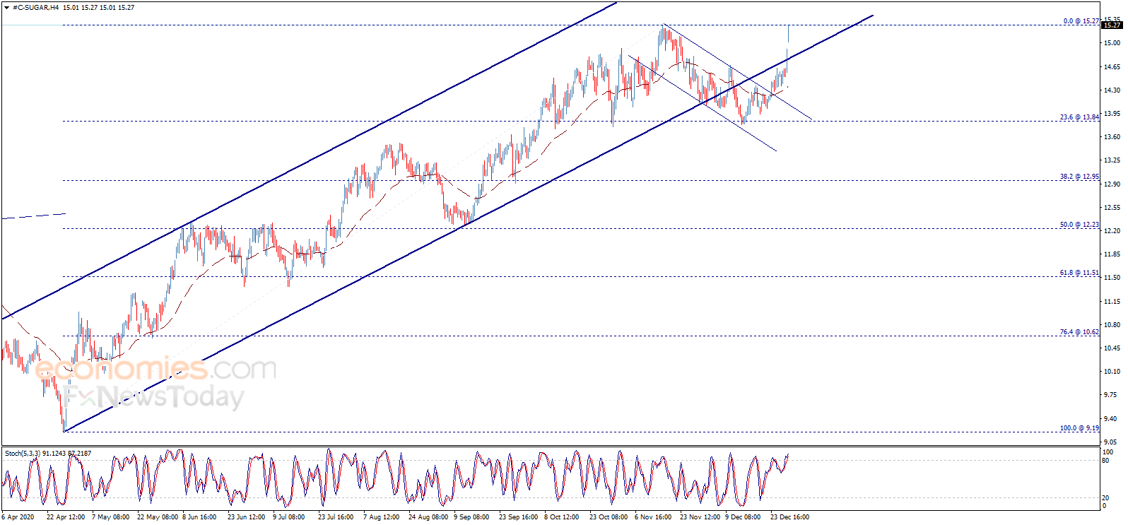Sugar price opens today’s trading with strong rise to succeed touching our waited target at 15.27, and we expect the continuation of the bullish trend to surpass this level and open the way to head towards 15.42 that represents our next positive station, to continue suggesting the bullish trend in the upcoming sessions unless breaking 14.75 and holding below it.