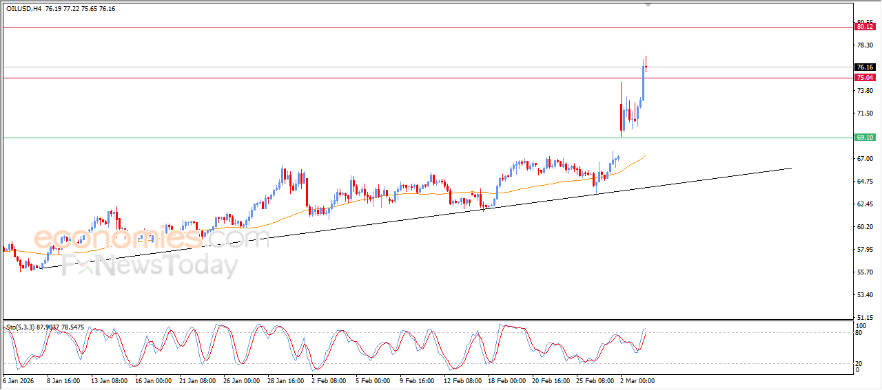 The price of (crude oil) surged high in its last intraday trading, breaching $75.00 resistance, which represented an expected target in our previous analysis, taking advantage of the positive signals emergence from relative strength indicators, amid the dominance of the main bullish trend on short-term basis, with the continuation of the dynamic pressure that is represented by its trading above EMA50, reinforcing the chances of extending its gains in the upcoming period.