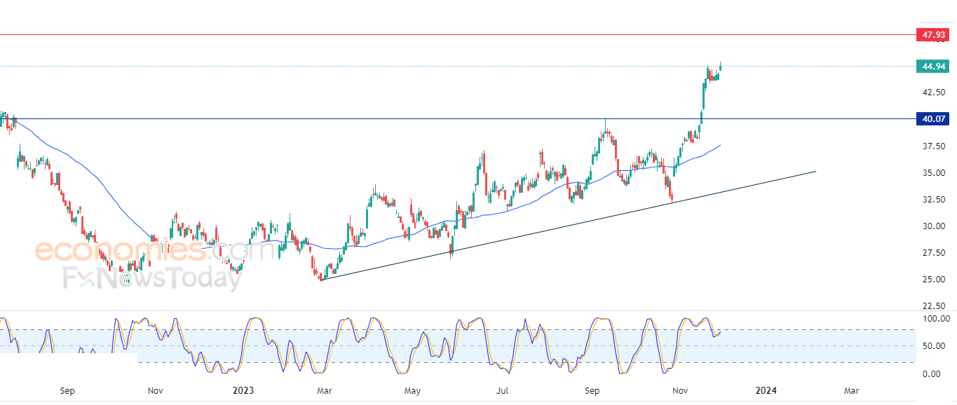 Therefore we expect more gains for the stock, targeting the resistance of 47.90, provided the support of 40.10 holds on.